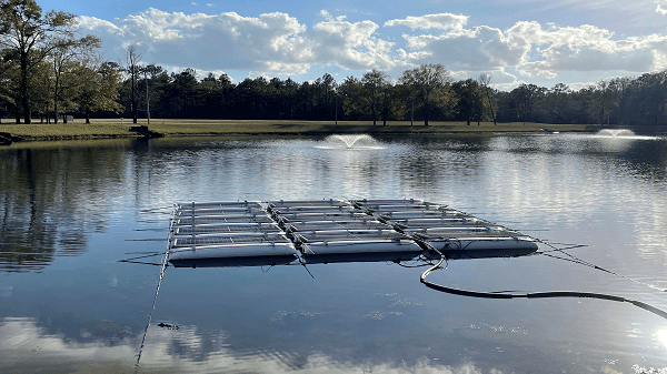 浮動太陽能系統(tǒng)使用可再生能源為三個增氧機供電,用于改善生產設施中池塘的水質。