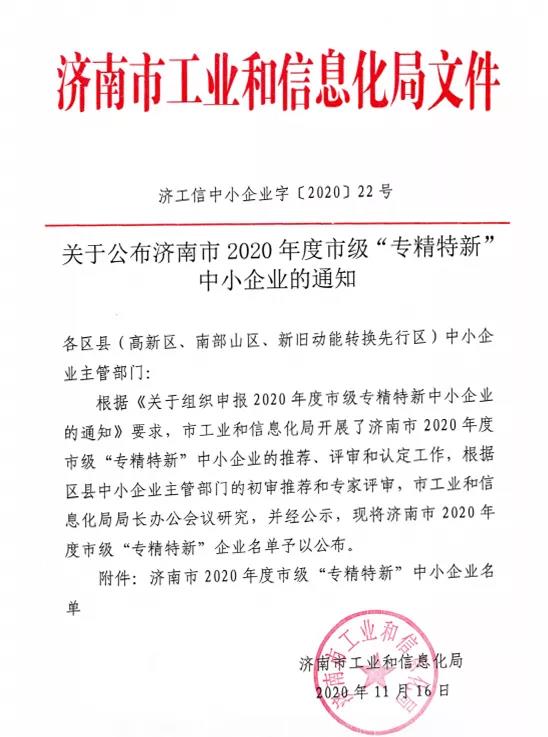 11月16日,濟(jì)南市工業(yè)和信息化局公布濟(jì)南市2020年度市級(jí)“專(zhuān)精特新”中小企業(yè)名單,山東犀牛高分子材料有限公司成功入選濟(jì)南市2020年度“專(zhuān)精特新”中小企業(yè)!