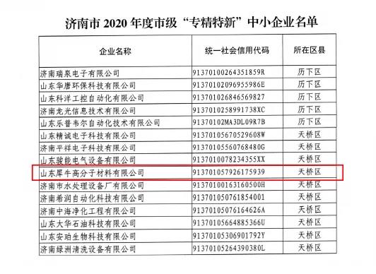 山東犀牛高分子材料有限公司入選“2020年度濟(jì)南市專(zhuān)精特新中小企業(yè)”!