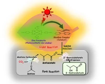 因此,如果能夠模擬這種自然光合作用的過程,將需要削減的二氧化碳作為原料與有機化合物結(jié)合,轉(zhuǎn)變成塑料制品等耐久性原材料,則可為二氧化碳削減作出貢獻。近日,大阪市立大學的科學家已經(jīng)成功地從丙酮和CO2中合成了3-羥基丁酸鹽,這是聚-3-羥基丁酸鹽(PHB)的原料:一種堅固的,不溶于水的,可生物降解的塑料,可用于包裝材料。利用太陽光和兩種生物催化劑的可見光驅(qū)動催化系統(tǒng),研究人員實現(xiàn)了約80%的高轉(zhuǎn)化率。本研究模仿自然光合作用,人為地再現(xiàn)了涉及陽光的光反應和暗反應固定CO2,以合成PHB的原料。這一發(fā)現(xiàn)有望有助于解決塑料廢物問題和減少二氧化碳。